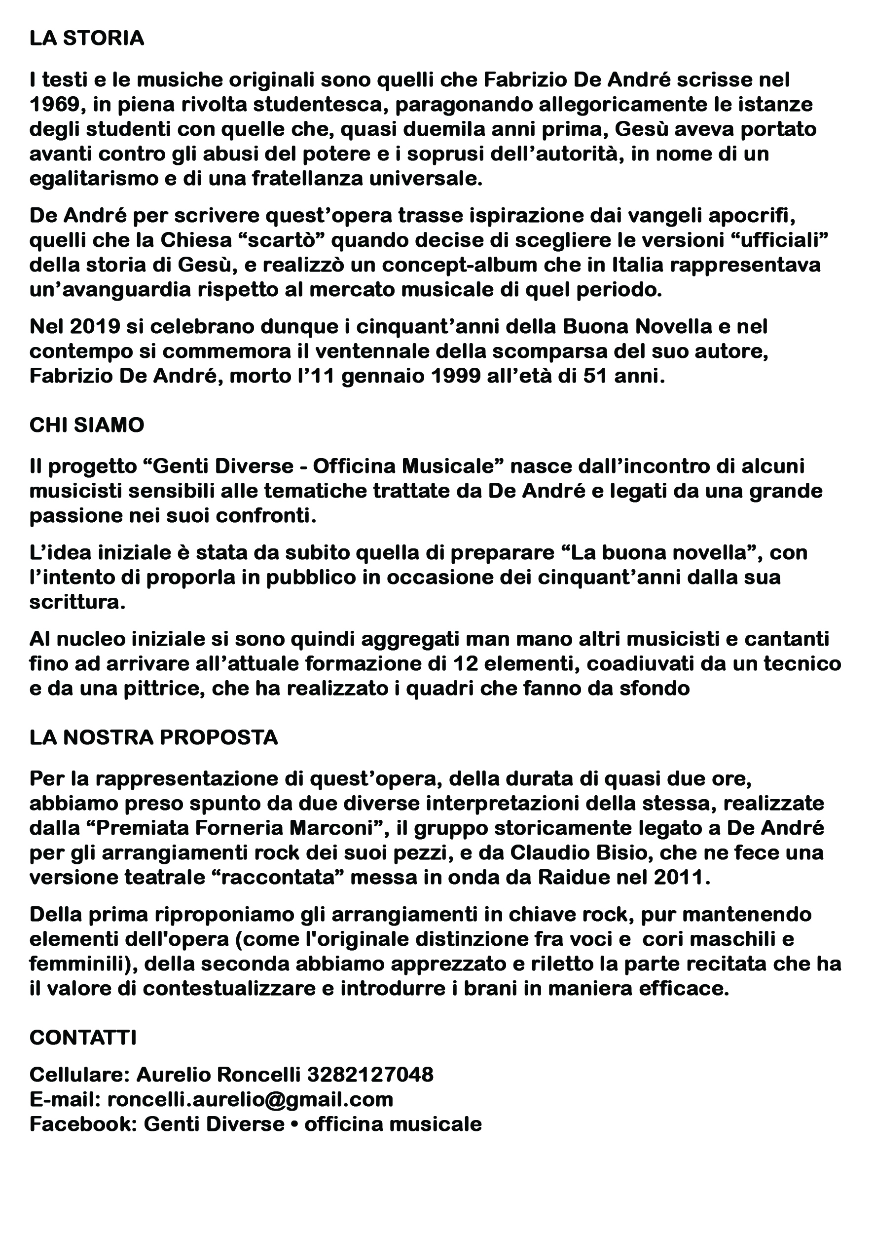 Quest'anno ricorrono i vent'anni dalla scomparsa di De André ed i cinquant'anni de "La Buona Novella", opera ispirata ai vangeli apocrifi che l'artista scrisse appunto nel 1969.